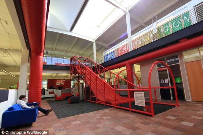 Salah satu karyawan yang sedang bermain perosotan. Cocok untuk melepas stress saat kerjaan numpuk.Β (Foto: storyepic)