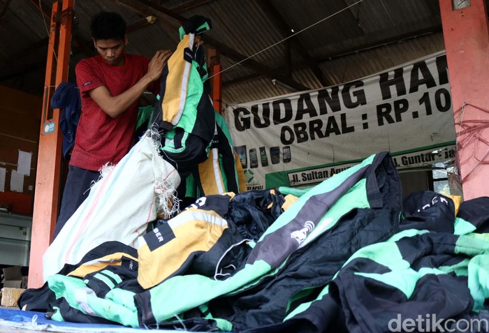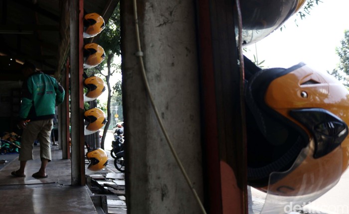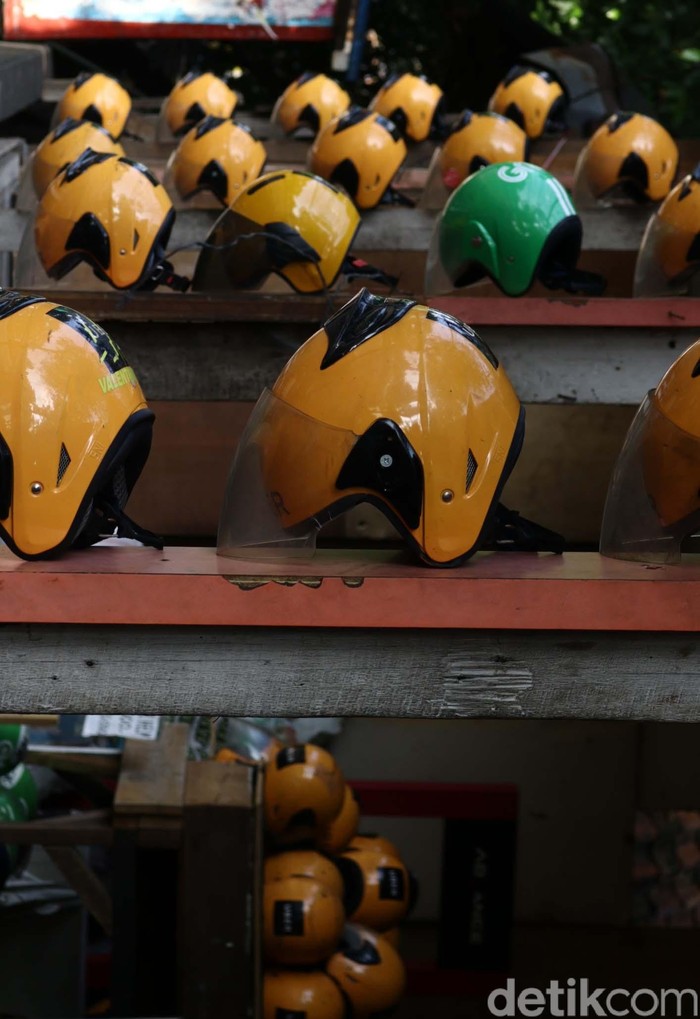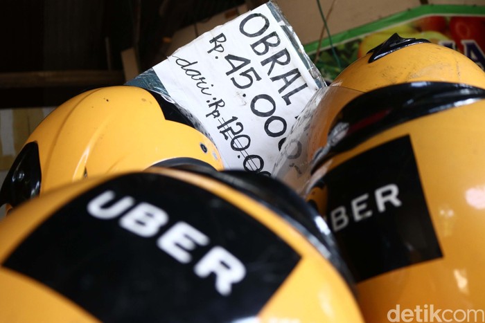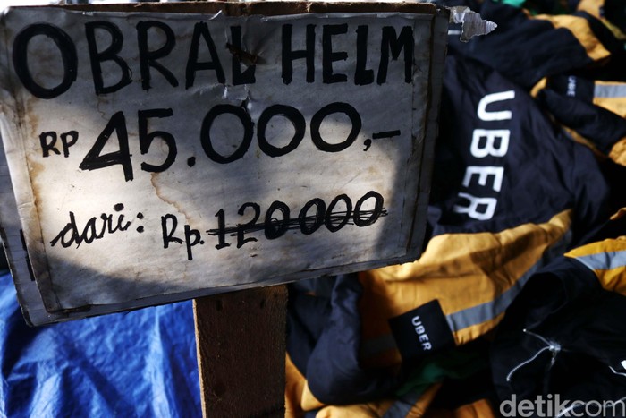 Perlengkapan Uber dari jaket hingga helm banyak dijual di Jl. Sultan Agung, Jakarta Selatan. Mulai besok 8 April 2018 aplikasi Uber sudah tak dapat digunakan.