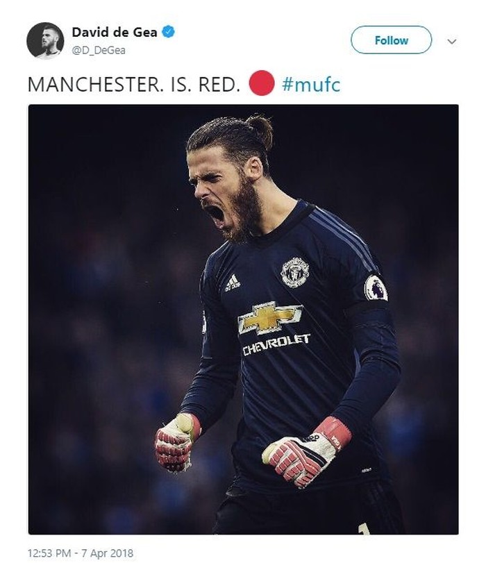 Saking girangnya, De Gea sampai menulis "Manchester is Red" lewat akun Twitter miliknya. Foto: Istimewa