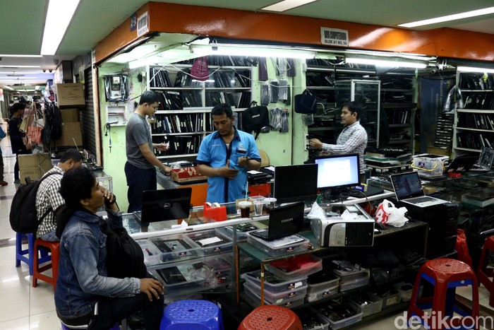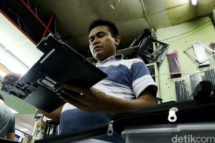 Penampakan salah satu 'dokter laptop' tengah memperbaiki komponen yang rusak di toko Daya Computerindo, Harco Mangga Dua Plaza, Jakarta Pusat, Rabu (11/4/2018).