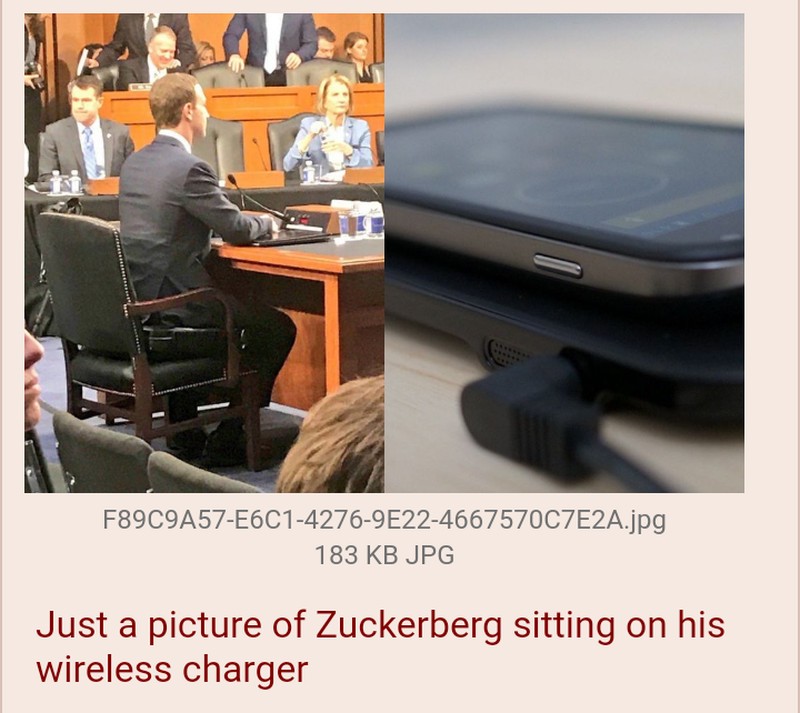 Bahkan ia juga didudukkan di atas wireless charging agar baterainya tidak habis. Pada kenyataannya, kursi Zuck memang ditambah dengan semacam bantal tebal. (Foto: Twitter)