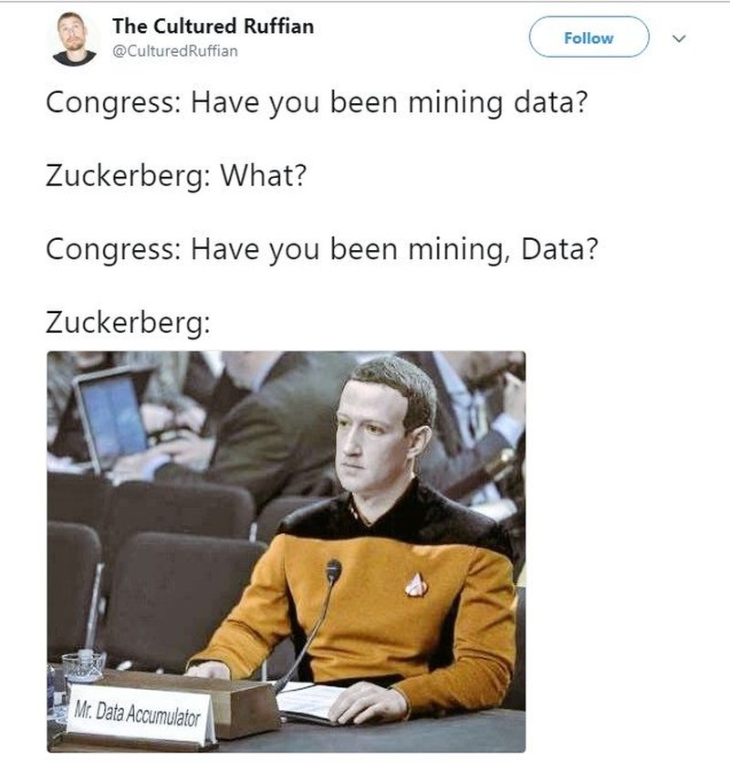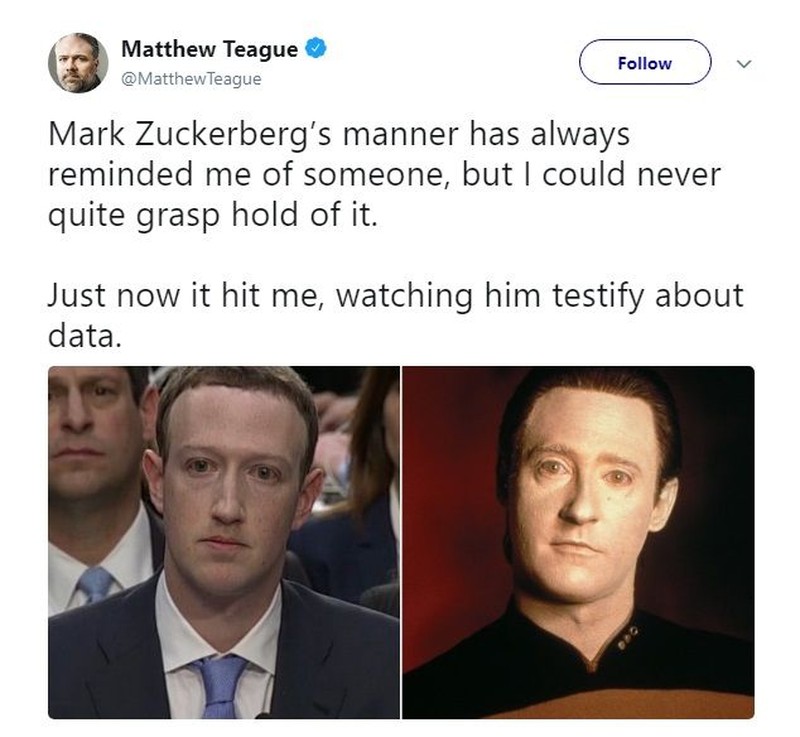 Selain disamakan dengan robot, Zuck juga diidentikan sebagai salah satu karakter dalam film Star Trek, yang uniknya bernama Data. (Foto: Twitter)