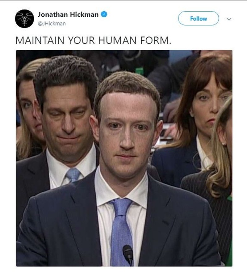 Begini tampang Zuckerberg saat harus mempertahankan 'bentuknya sebagai manusia'. (Foto: Twitter)