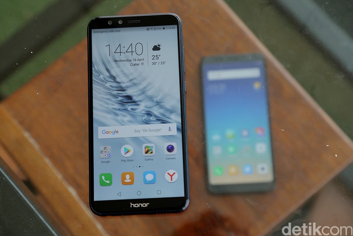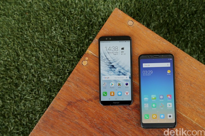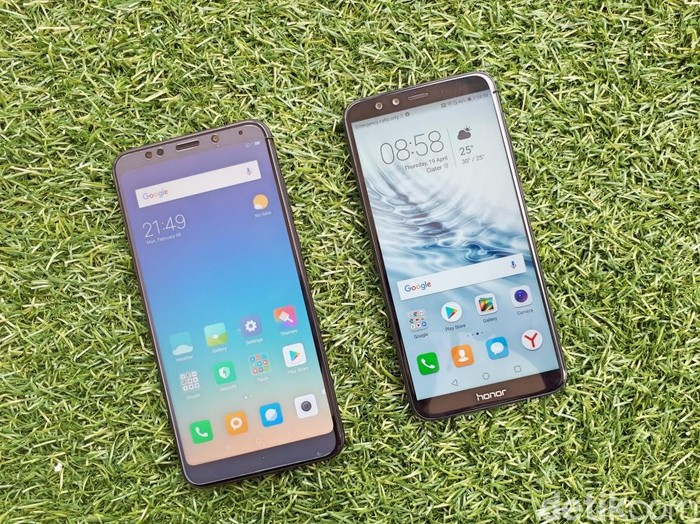 Penampakan kedua ponsel kala disandingkan.Β Oh ya, sistem operasi Honor 9 Lite sudah Android 8.0 Oreo sedangkan Redmi 5 Plus masih Nougat.Β Foto: detikinet