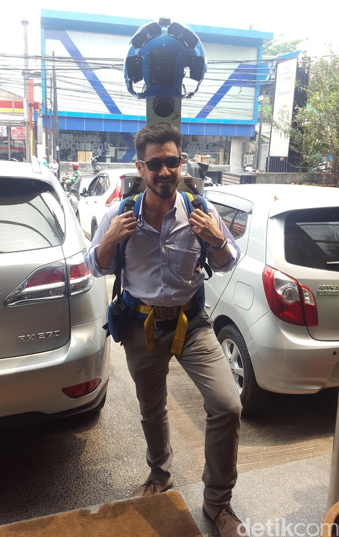 Meski memiliki bobot 18 kilogram, hal ini tidak menyurutkan Jason Tedjasukmana, Head of Communication Google Indonesia, untuk coba menggunakan Trekker. Foto: Muhamad Imron Rosyadi/detikINET