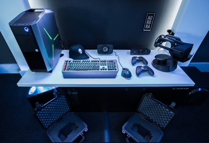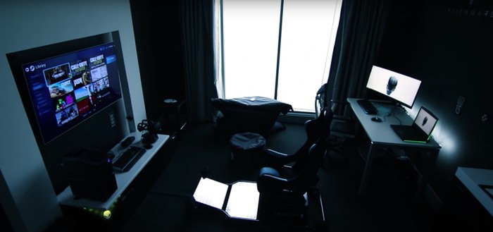 Sebut saja TV OLED 4K berukuran 65 inch, PC Alienware dengan spek Core i7-7800 dengan GPU GTX 1080Ti, yang dilengkapi dengan kontroler Xbox One Elite dan sebuah Oculus Rift. Foto: YouTube/Latinoamerica