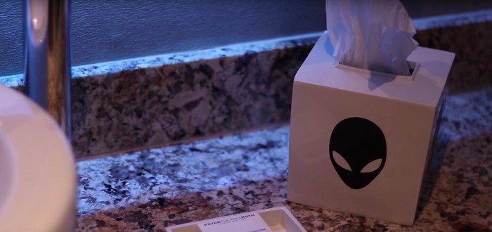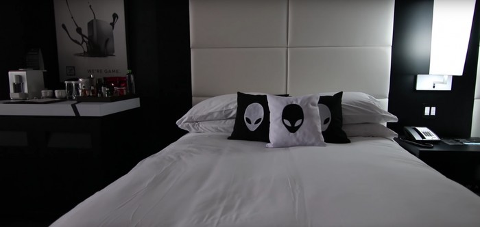 Hingga ke perlengkapan kamar seperti sarung bantal, seprei dan kotak tisu seperti ini, sengaja mengusung desain Alienware. Foto: YouTube/Latinoamerica
