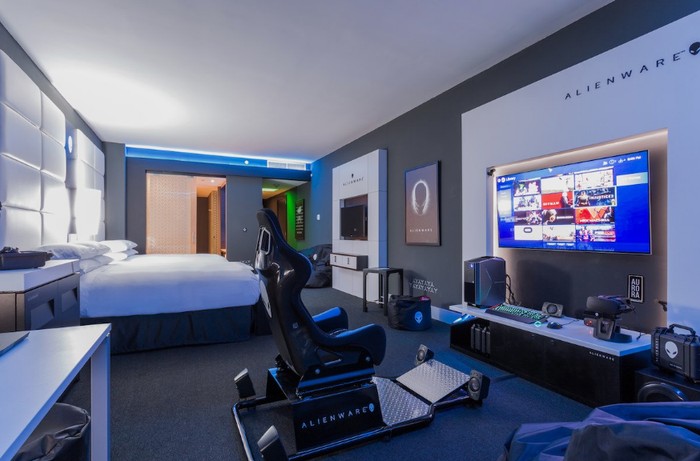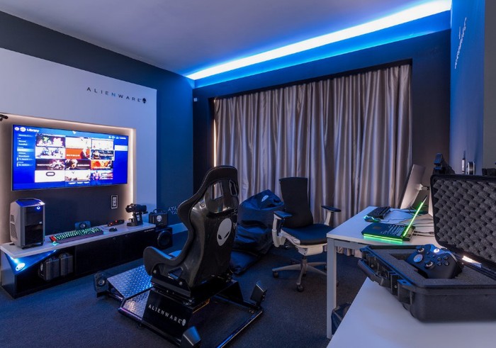 Kamar dengan dua tempat tidur ini juga mempunyai sebuah beanbag dengan logo Alienware. Foto: YouTube/Latinoamerica