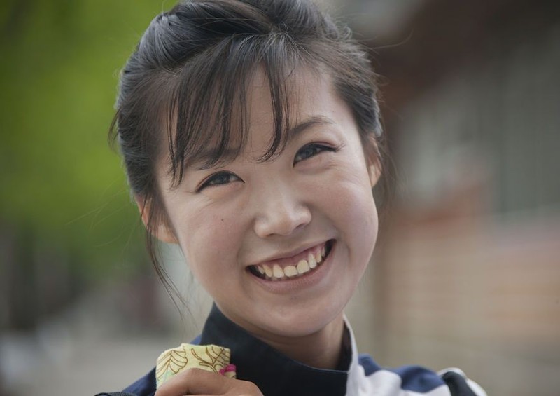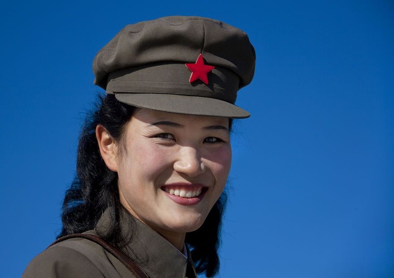 Senyum manis tentara perempuan di Menara Ide Juche, Pyongyang, Korea Utara. (Foto: Eric Lafforgue)