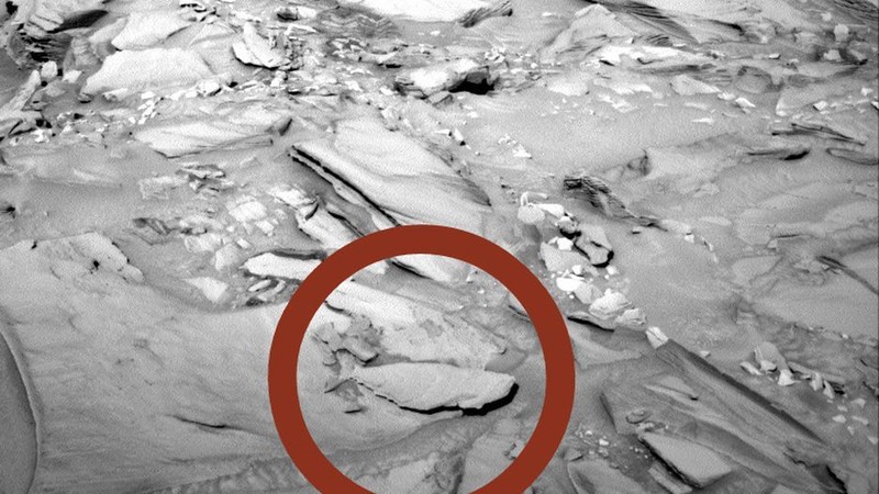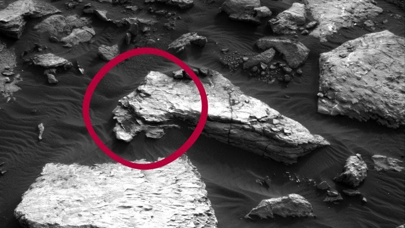 Ini bukanlah penampakkan dari ikan yang sedang berenang di Mars, maupun fosil dari hewan tersebut. Foto yang ditangkap oleh rover Curiosity ini murni sebuah batu yang menyerupai ikan. (Foto: CNET)