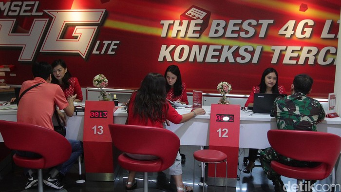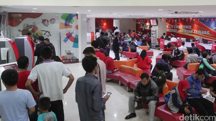 Para pelanggan berdatangan ke gerai Telkomsel, Jakarta, Senin (30/4/2018).