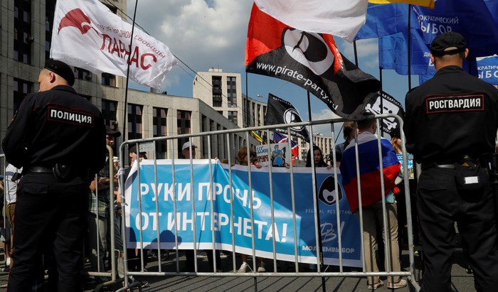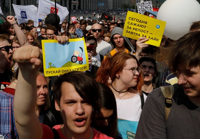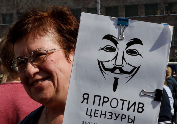 MerekaΒ meneriakkan slogan anti pemerintah dan membawa spanduk berisi pesan anti sensor internet. "Pihak berwajib ingin mengambil pesan rahasia milik kita, kehidupan pribadi kita", teriak Mantan Perdana Menteri Rusia dan politisi oposisi, Mikhail Kasyanov. (Foto: Reuters/Tatyana Makeyeva)