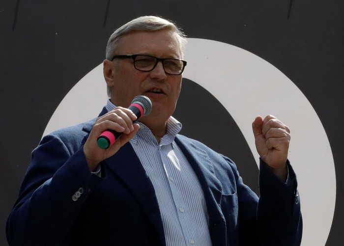 Mantan Perdana Menteri Rusia dan politisi oposisi Mikhail Kasyanov turut menyampaikan orasi dalam protes di Moskow menentang pemblokiran Telegram. (Foto: Reuters/Tatyana Makeyeva)