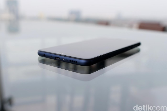 Di bagian bawah Honor 7X, pengguna akan mendapati microUSB, colokan headphone 3,5 mm serta speaker. Foto: Muhammad Ridho
