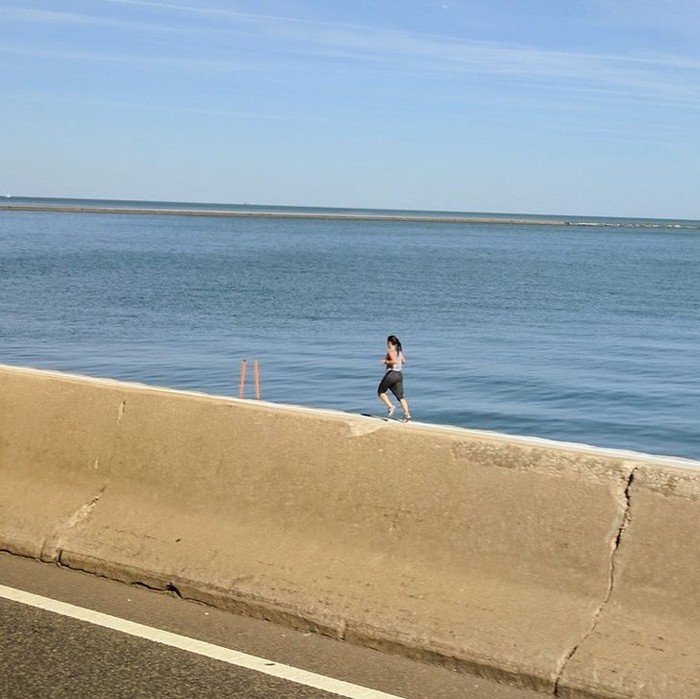 Wanita ini terlihat berlari di atasΒ pembatas jalan. (Foto: Brightside)