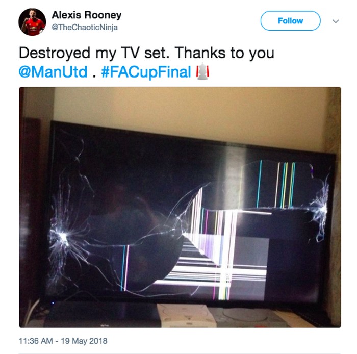 Seorang fans memposting gambar ia merusak televisi karena kecewa dengan penampilan MU. Foto: istimewa