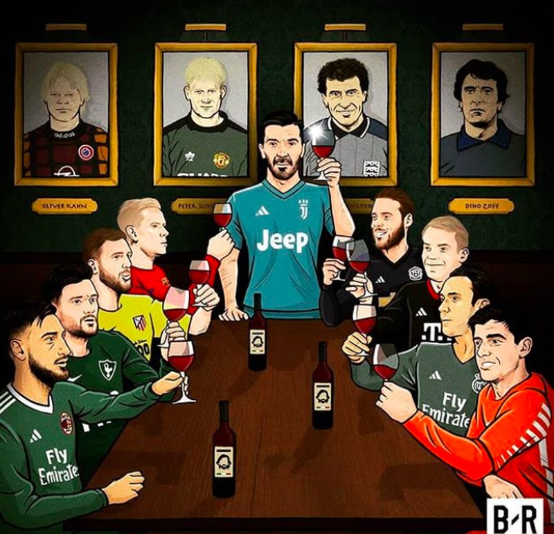 Buffon di sini digambarkan sebagai kiper legendaris yang dihormati kiper lainnya. Di latar belakang, ada foto-foto kiper hebat di masa silam. Foto: istimewa