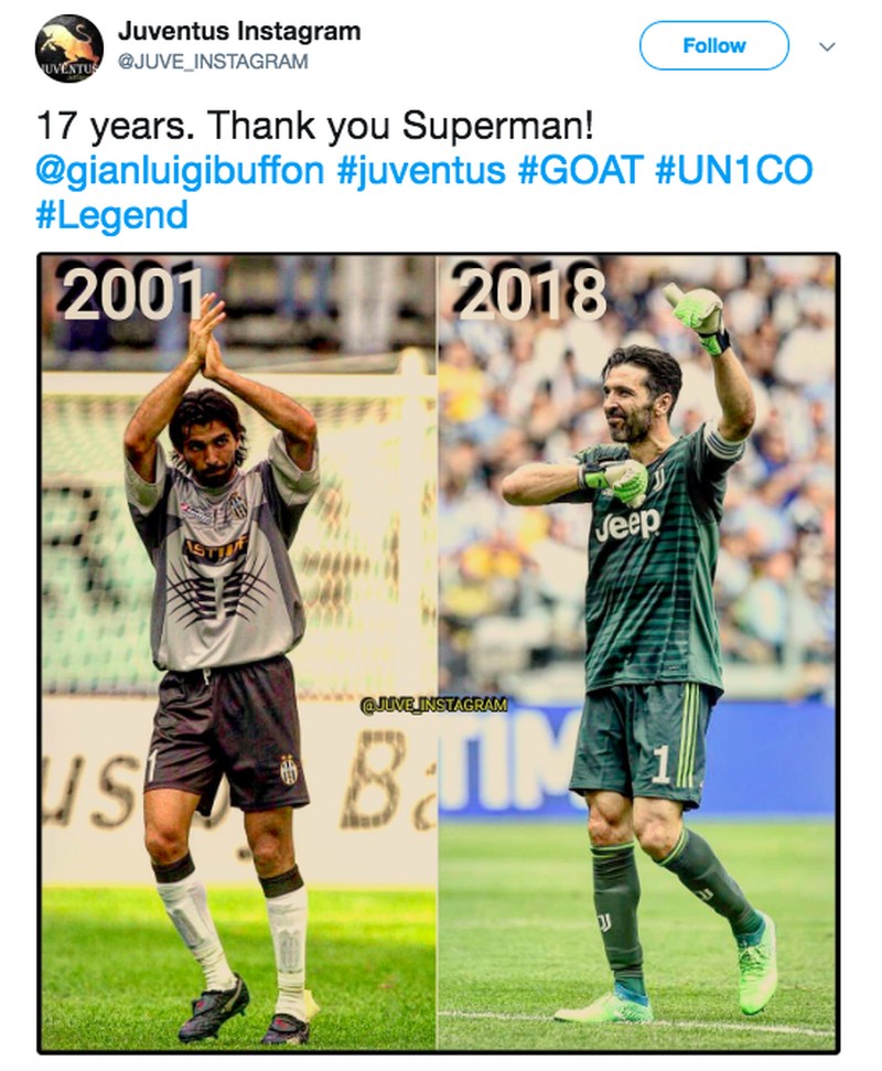Tahun 2001 pertama kali Buffon merumput bersama Juventus dan tahun ini jadi yang terakhir. Foto: istimewa