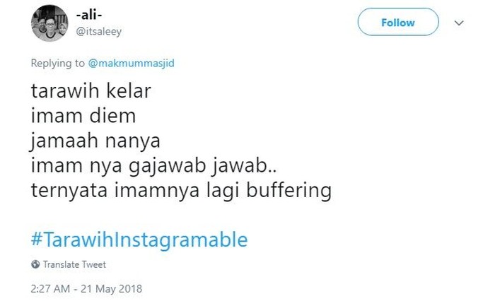 Baru tau kalau imam bisa buffering, mungkin dia mimpin salatnya live streaming kali ya. Foto: istimewa