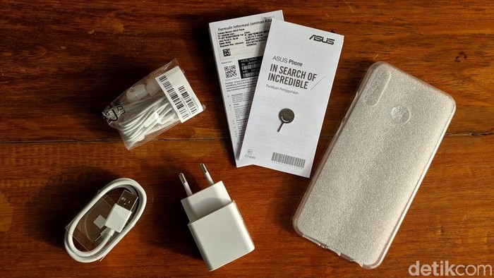 Aksesori yang disertakan dalam paket penjualan terbilang lengkap. Ada charger, kabel data, earphone, buku panduan dan garansi, colokan slot SIM Card dan case transparan. Foto: Adi Fida Rahman/detikINET
