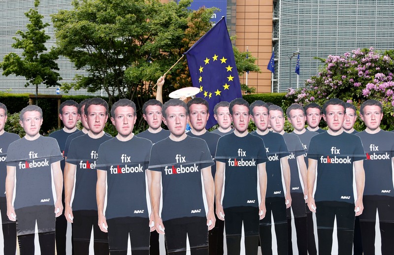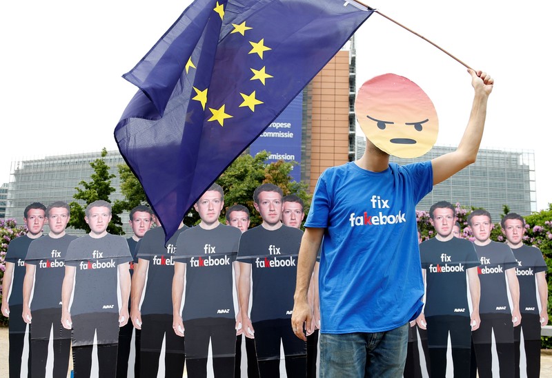 Mereka mengenakan papan dengan wajah Mark Zuckerberg. (Foto: Reuters)