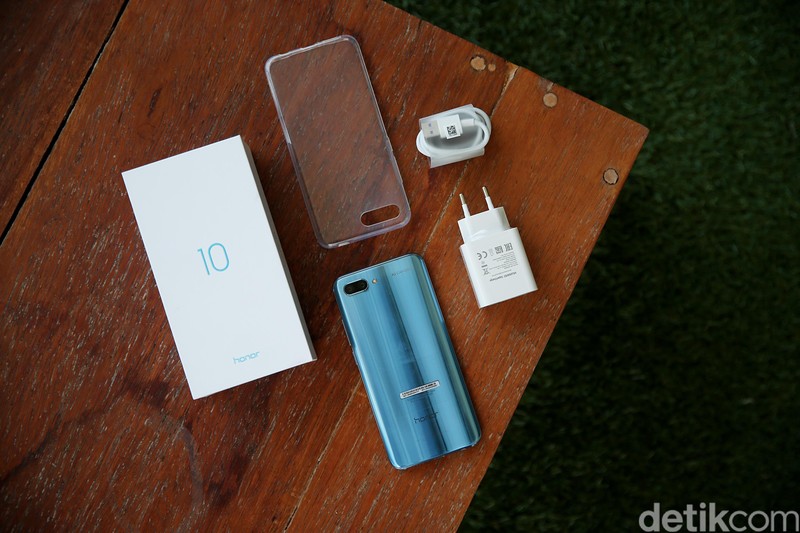 Kelengkapan di dalam kemasan meliputi casing pelindung transparan dan pengisi daya, selain tentunya si ponsel Honor 10. Foto: Muhammad Ridho