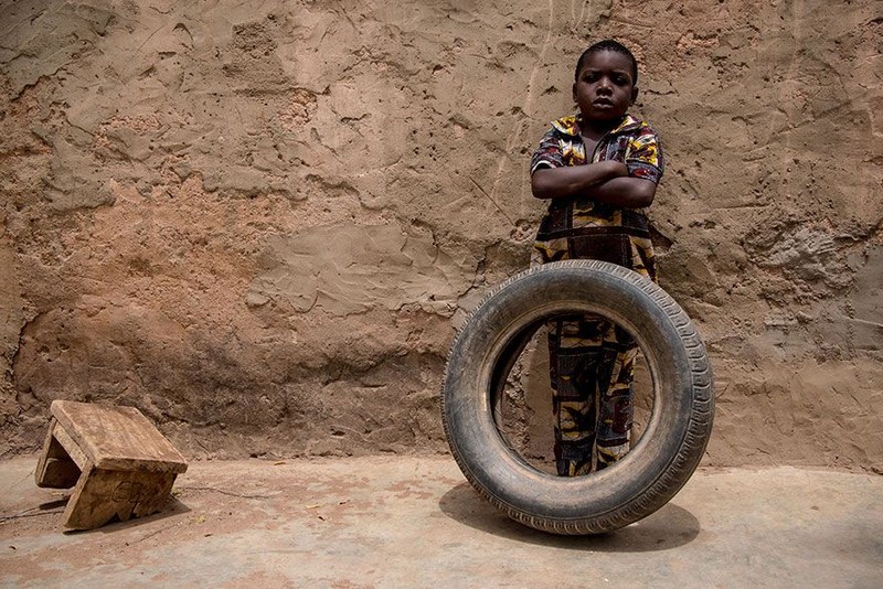Orang tua anak ini di Burkina Faso menghasilkan USD 29 per bulan. Mainan favoritnya adalah ban usang. Foto: Gapminder