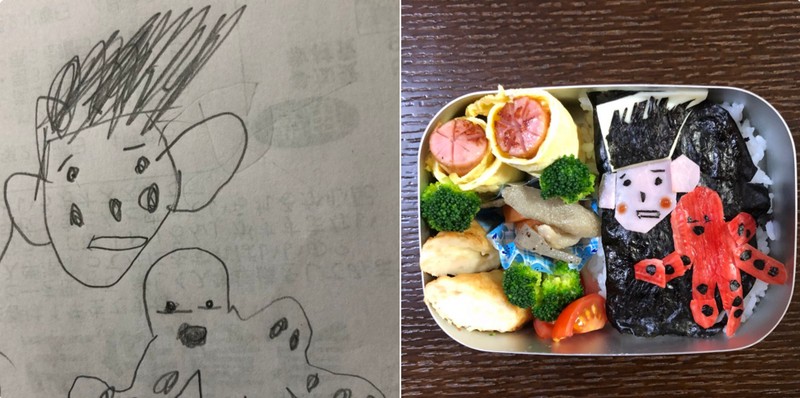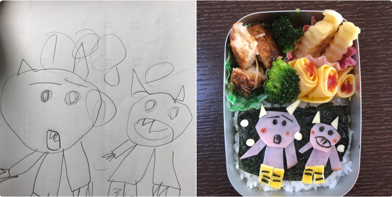 Dibilang kreatif karena ia membuat bento-bentonya tersebut dari hasil gambar yang berantakan buatan anaknya yang memang masih kecil. (Foto: Twitter)