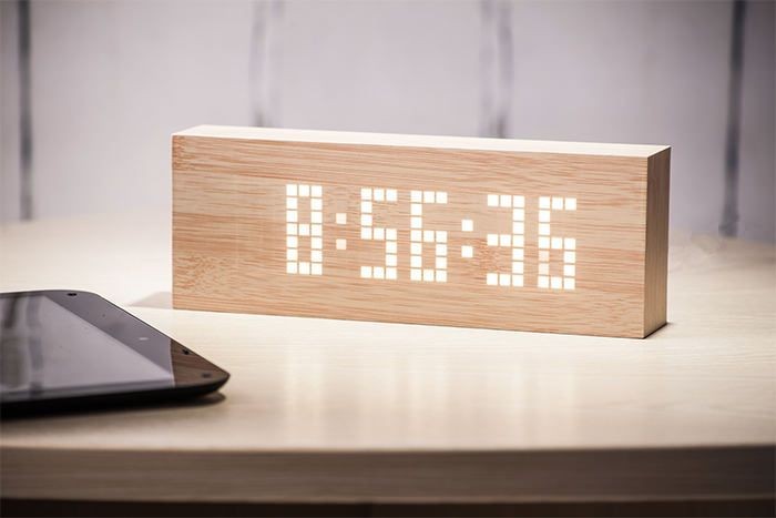 LED teak cube. Alarm berbentuk kubus ini menampilkan waktu, tanggal dan suhu. Materialnya terbuat dari kayu namun dengan tampilan jam LED. Alarm ini hanya akan menampilkan jam jika disentuh atau ketika alarm menyala.Β Foto: Istimewa
