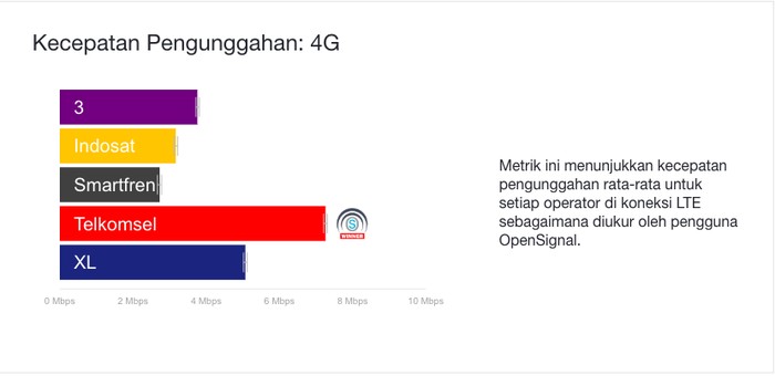 Kategori Kecepatan PengunggahanΒ 4G dimenangi oleh Telkomsel. Foto: OpenSignal