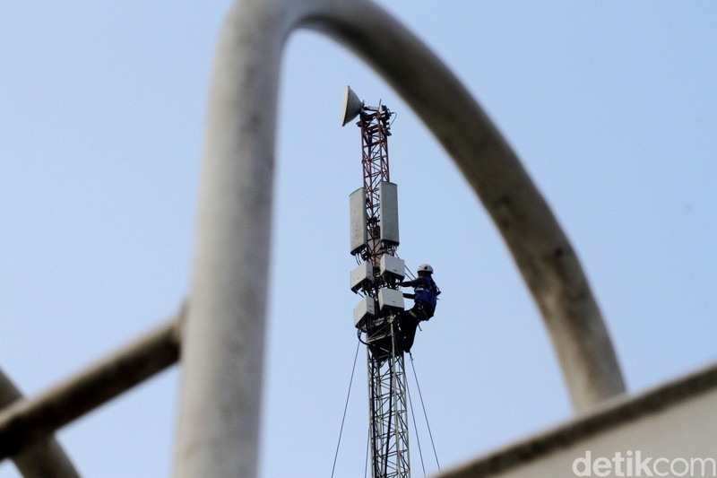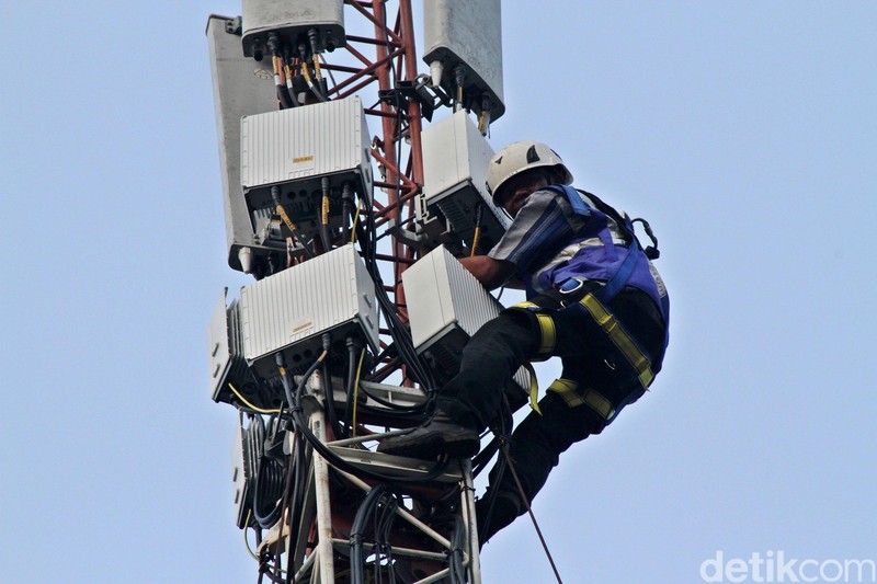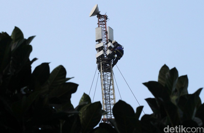 Petugas memanjat BTS untuk mengecek jaringan XL Axiata