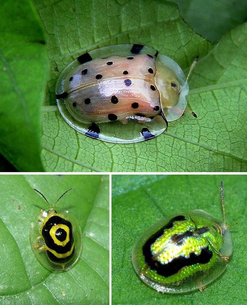 Kumbang ini berjenis tortoise shell beetle. Tubuh kumbang ini memang tidak transpran sepenuhnya, melainkan hanya bagian cangkangnya yang tembus pandang. Bagian transparan tersebut digunakan sebagai pelindung diri untuk menyamar dari musuh. (Foto: boredpanda)