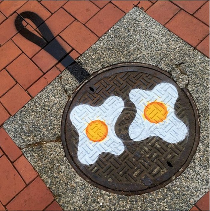 Seperti yang satu ini, dia membuat penutup saluran air menjadi teflon berisi telur. (Foto: Instagram/tombobnyc)