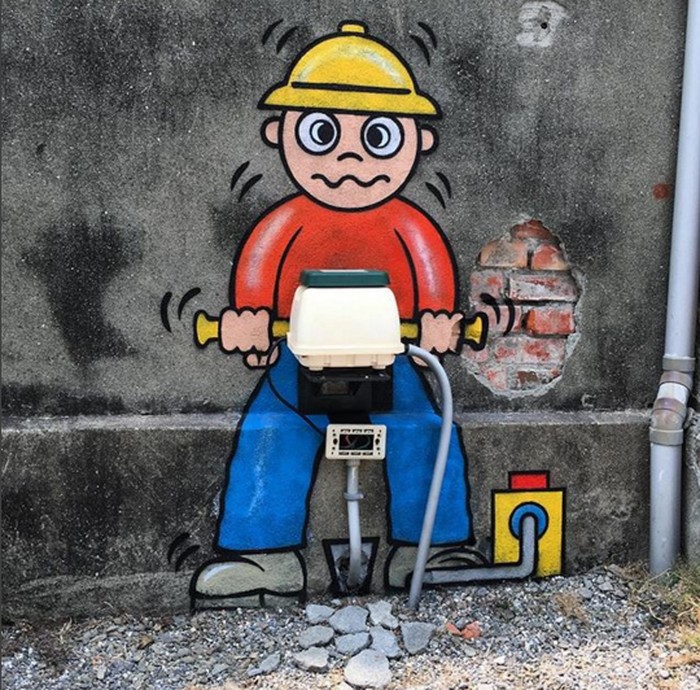 Pria berkebangsaan Amerika ini membuat kreasi keren dengan memadukan objek benda mati seperti seperti tiang listrik hingga kipas AC ke dalam sebuah gambar animasi. (Foto: Instagram/tombobnyc)
