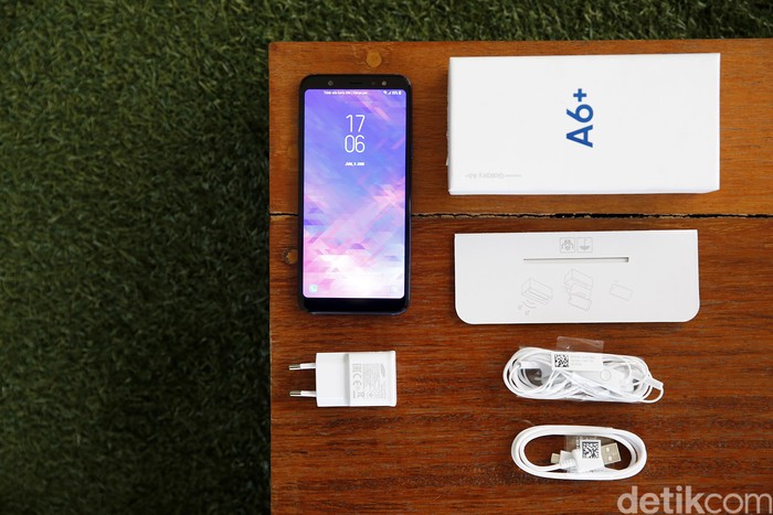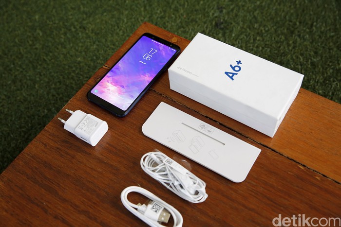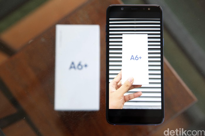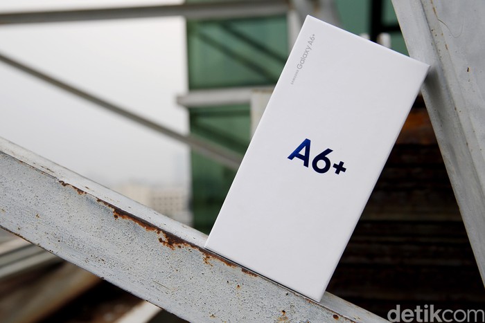 Ini kemasan Galaxy A6+ dengan warna putih dan logo besar A6+ berwarna biru. Foto: Muhammad Ridho