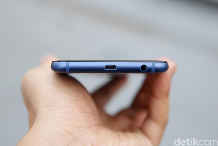 Bagian bawah akan dijumpai colokan pengisi daya microUSB serta colokan headphone standar 3,5 mm. Foto: Muhammad Ridho