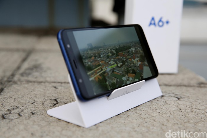 Inilah tampang Galaxy A6+. A6+ dan juga A6 hadir dengan layar super AMOLED aspek rasio 18,5:9. Bedanya hanya di ukuran dan resolusinya saja. Galaxy A6 punya bentangan 5,6 inch dengan resolusi HD+, sementara Galaxy A6+ berukuran 6 inch Full HD+. Foto: Muhammad Ridho