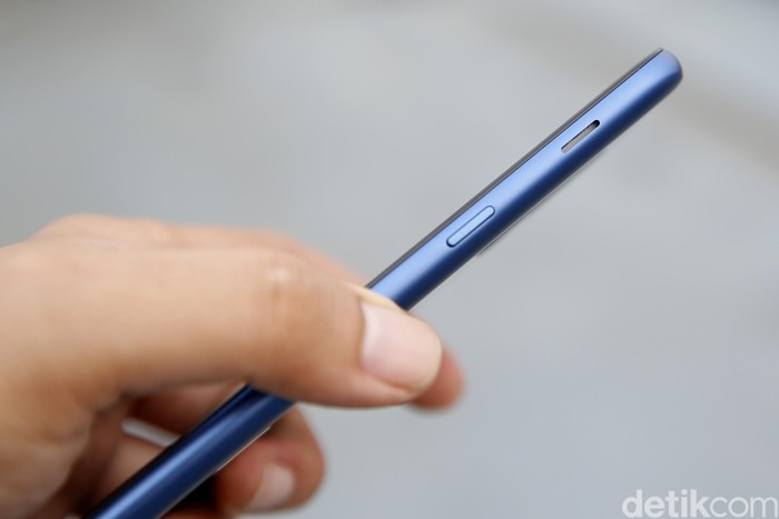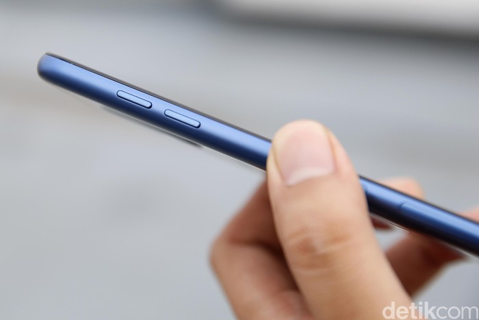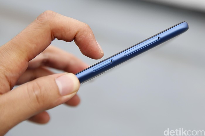 Di bagian sisi kiri akan dijumpai tombol volume. Kemudian di bawahnya ada slot untuk memasukkan SIM card, di bawahnya ada lagi untuk memasukkan SIM Card kedua serta microSD. Foto: Muhammad Ridho