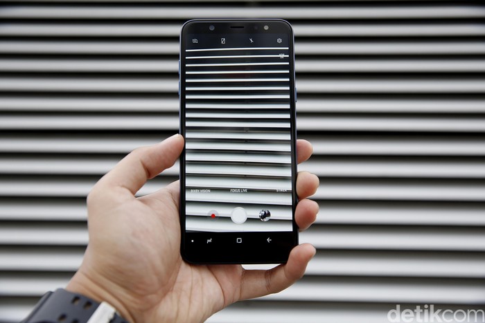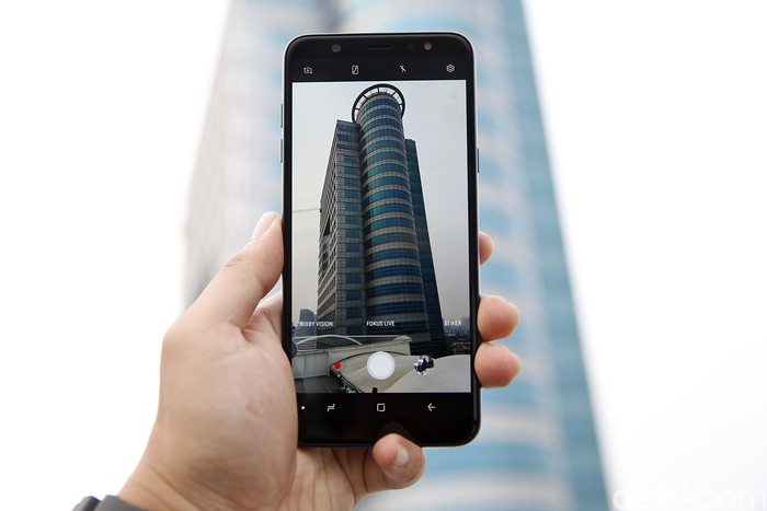Interface kamera Galaxy A6+. Dengan adanya dual kamera, pengguna dapat membuat foto bokeh dengan fitur Live Focus seperti di Galaxy S9+. Untuk kebutuhan selfie, ada kamera depan 24 MP dengan aperture f/1.9. Foto: Muhammad Ridho