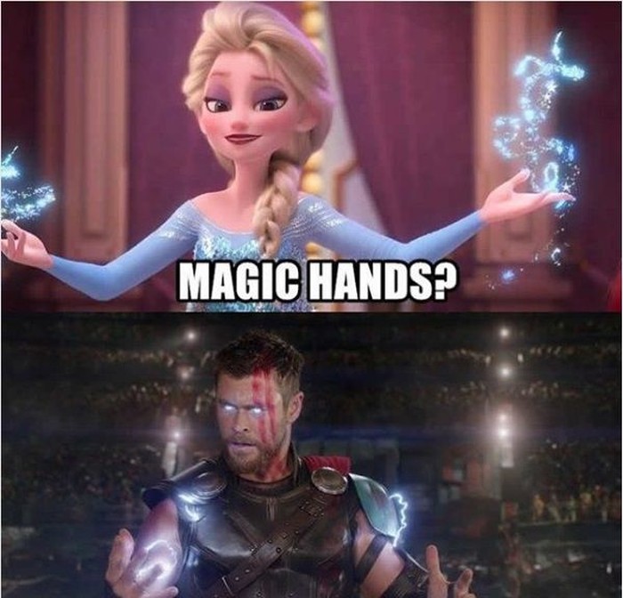 Kalau Elsa punya tangan ajaib untuk memunculkan es, tangan Thor malah bisa memercikkan petir.Β Foto: Instagram @9GAG
