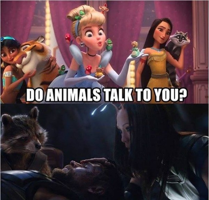 Cinderella dikenal akrab dan sering berbicara dengan hewan, sama dengan Thor saat diselamatkan sejumlah hewan di film Avengers: Infinity War.Β Foto: Instagram @9GAG