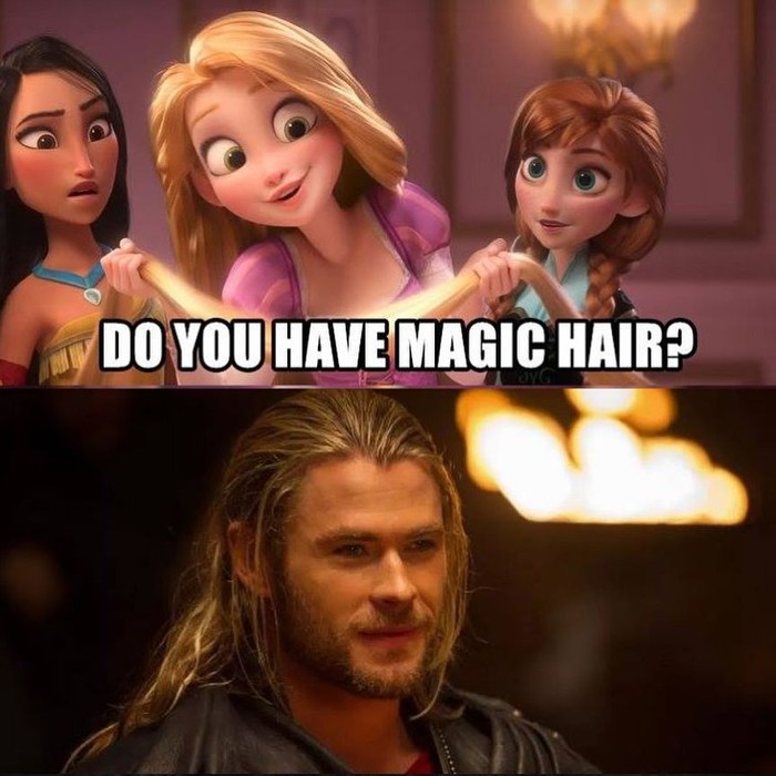 Rapunzel dalam film Tangled terkenal dengan rambut ajaibnya. Thor pun juga punya rambut panjang yang tak kalah indah.Β Foto: Instagram @9GAG