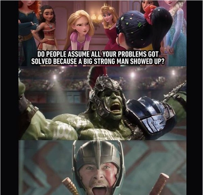 Para puteri Disney terkenal memiliki masing-masing pria yang mampu menyelamatkan mereka, dan Thor juga memiliki Hulk yang pernah menyelamatkannya di film Thor: Ragnarok.Β Foto: Instagram @9GAG