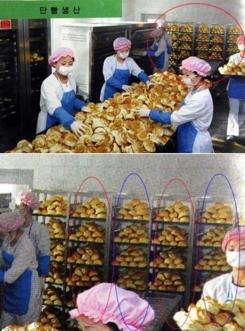 Tampak pabrik roti di Korut yang tampak melimpah produksinya. Padahal di latar belakang itu hanya hasil kopian karena bentuknya sama persis. Foto: Istimewa