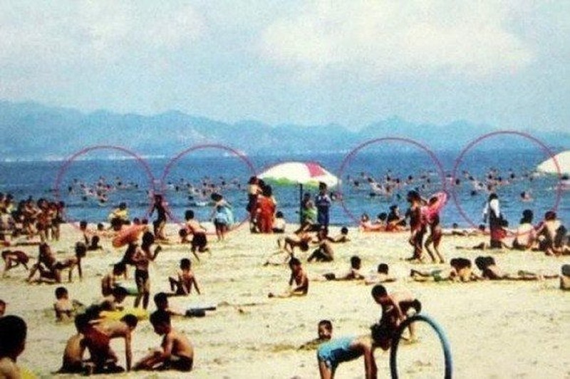 Pantai dengan latar belakang yang tampak ramai dan ceria. Tapi ternyata, gambar orang-orang berenang di laut itu identik satu dengan yang lain. Foto: Istimewa