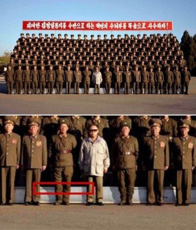 Foto dari tahun 2008 ini menampakan Kim Jong Il, pemimpin Korut saat itu, berada di depan barisan tentara. Tapi melihat bayangannya yang berbeda, dipastikan dia sebenarnya tidak pernah ada di sana. Foto: Istimewa