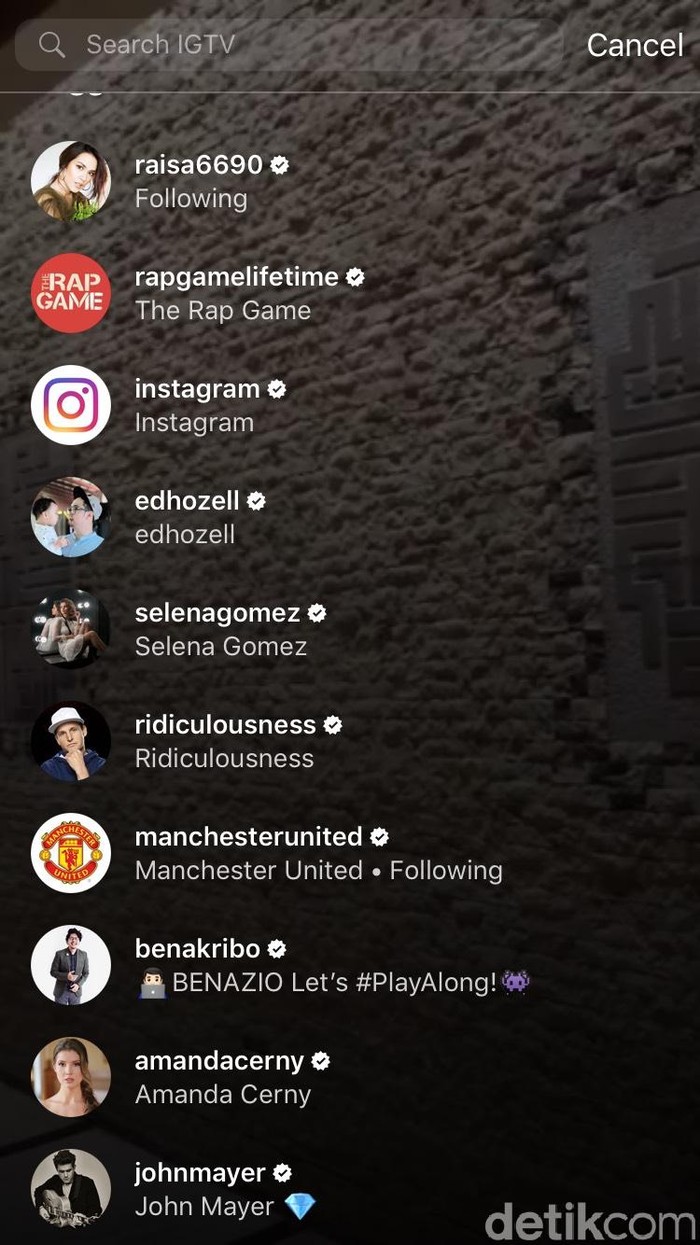 Pengguna juga bisa mencari akun melalui pilihan search. Terlihat akun yang memiliki IGTV masih belum banyak, di mana yang sudah ada, yaitu Raisa Andriana, Selena Gomez, Amanda Cerny, Bena Kribo, hingga John Mayer. Foto: detikINET/Agus Tri Haryanto