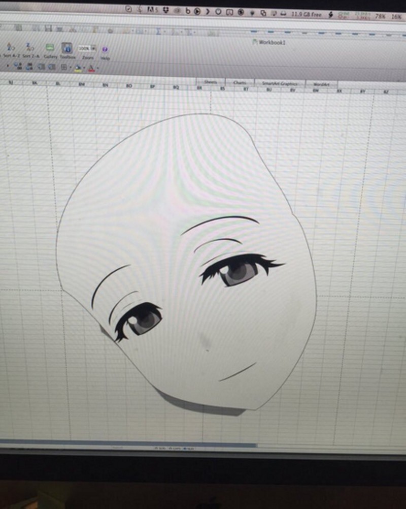 Ia bekerja di bidang game. Keahliannya memakai Microsoft Excel membuatnya mampu menghasilkan berbagai ilustrasi bergaya anime seperti ini. (Foto: Twitter/enbos)