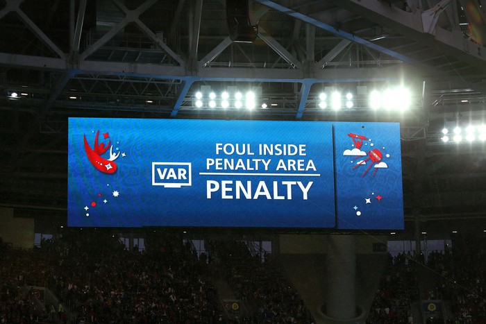 Layar raksasa di stadion tampak memperlihatkan bahwa sistem VAR sedang bekerja untuk menentukan penalti dapat diberikan atau tidak. Foto: Getty Images
