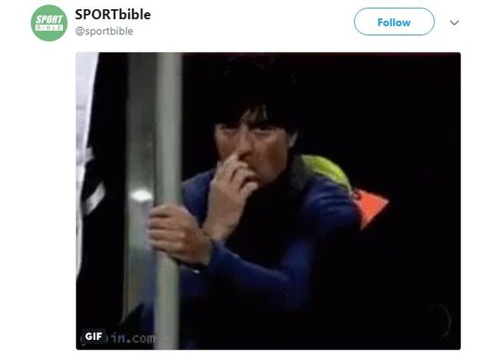 Di tengah pertandingan pun Loew tertangkap kamera tengah mengorek lubang hidungnya langsung dengan jari. Foto: Meme/Twitter